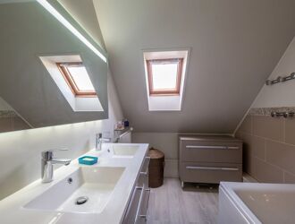 Le sous-sol total d’environ 90 m2, partiellement aménagé, comprend une buanderie ainsi qu’un espace bureau ou chambre d’appoint de 16m2 selon vos besoins.