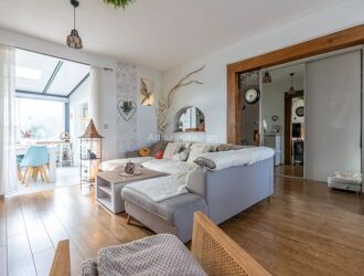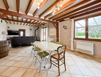 Dés l'entrée, la pièce de vie d’environ 58 m² offre un espace convivial où chacun peut trouver sa place : cuisine ouverte aménagée, salle à manger lumineuse, séjour chaleureux équipé d’un poêle Godin.