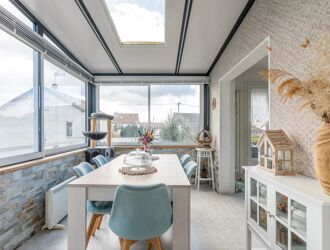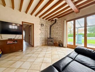 Cette maison se compose d’un salon chaleureux, d’un séjour prolongé par une véranda lumineuse donnant sur le jardin.